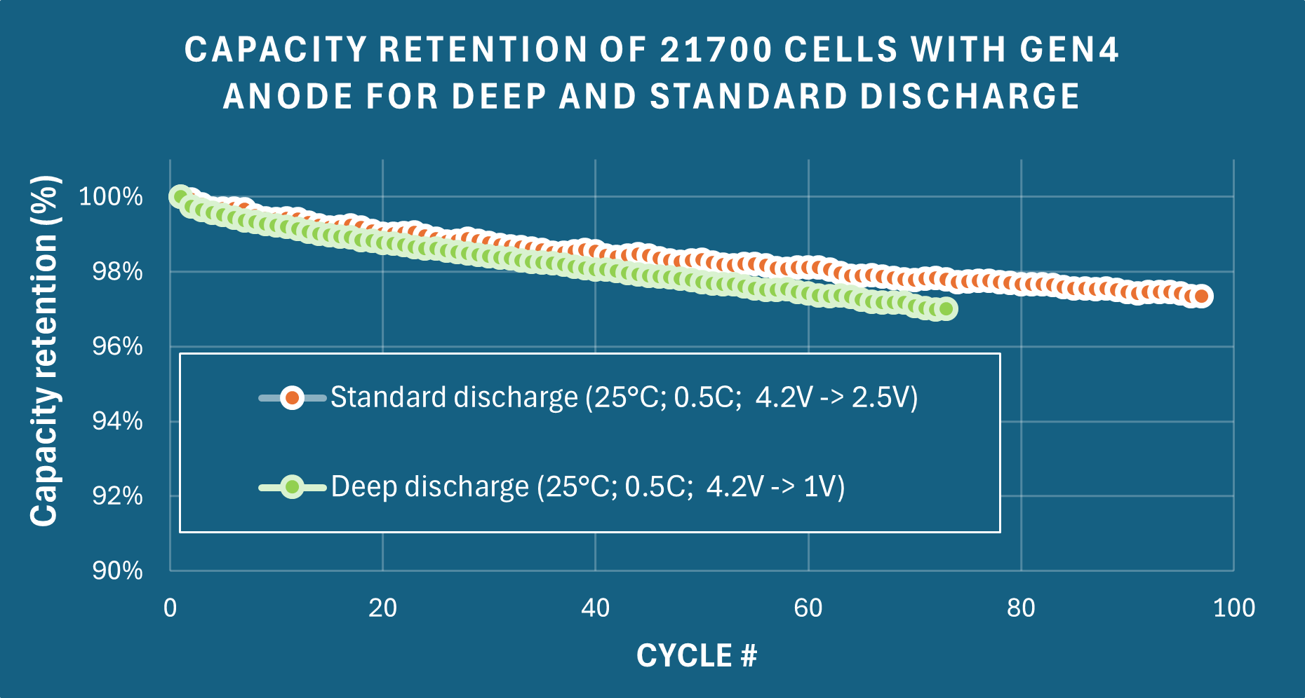 The fact that the GEN4 cell maintains stable cycling behavior across 70 cycles under deep discharge conditions (4.2V–1V, 0.5C), with capacity retention above 96%, is technically significant. It suggests that the GEN4 material architecture retains structural and electrochemical integrity under operating conditions that would be incompatible with conventional graphite anodes.