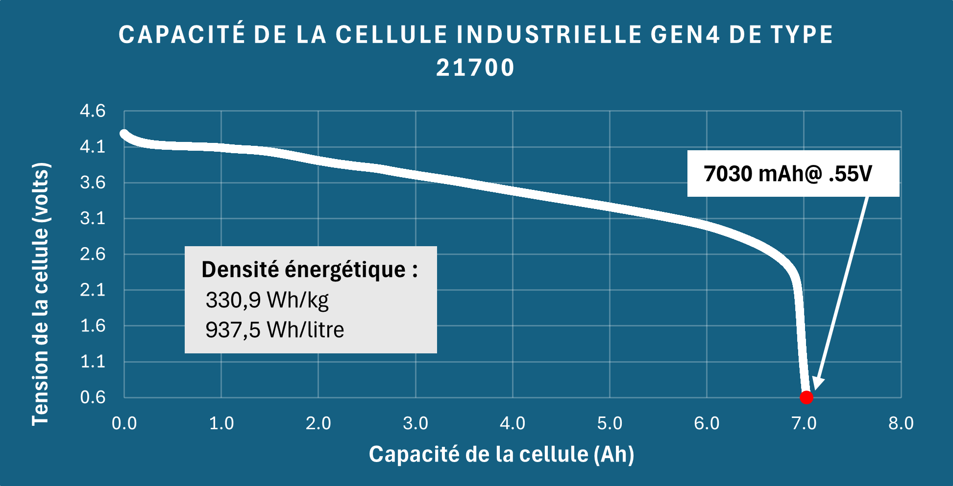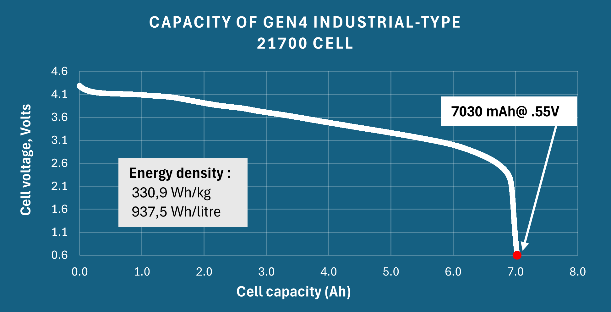 Total usable capacity reaches 7,030 mAh at the 0.55V cutoff. For reference, the same GEN4 material previously reported 6,696 mAh under standard conditions (4.2V–2.5V), meaning the extended window captures an additional ~334 mAh, or approximately 5% more energy per cycle. Commercially available graphite-based 21700 cells typically deliver between 4,800 and 5,000 mAh under standard conditions [2], placing GEN4 at a 40–46% premium over the current graphite baseline, even before accounting for the extended protocol gains.