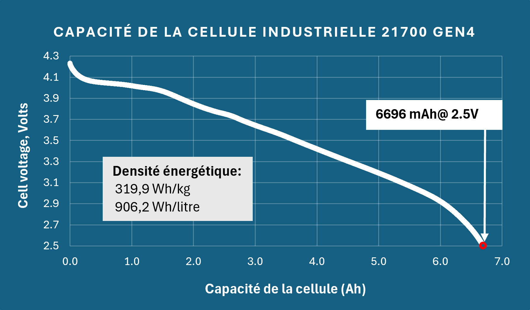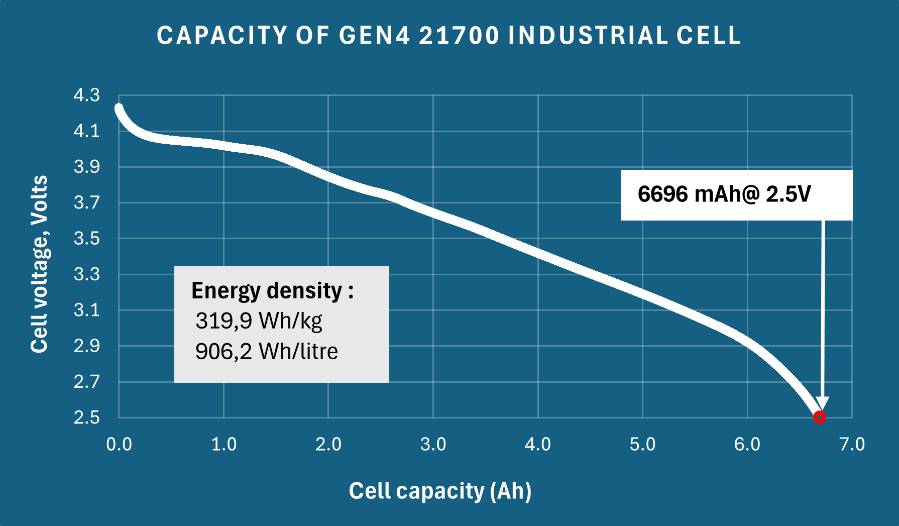 The electrochemical performance of GEN4 extends beyond capacity into energy density and discharge behavior. The 21700 cell achieved a measured discharge capacity of 6,696 mAh at a 2.5V cutoff, with a gravimetric energy density of 319.9 Wh/kg and a volumetric energy density of 906.2 Wh/L. These values position the system at the upper end of current lithium-ion performance ranges [2].