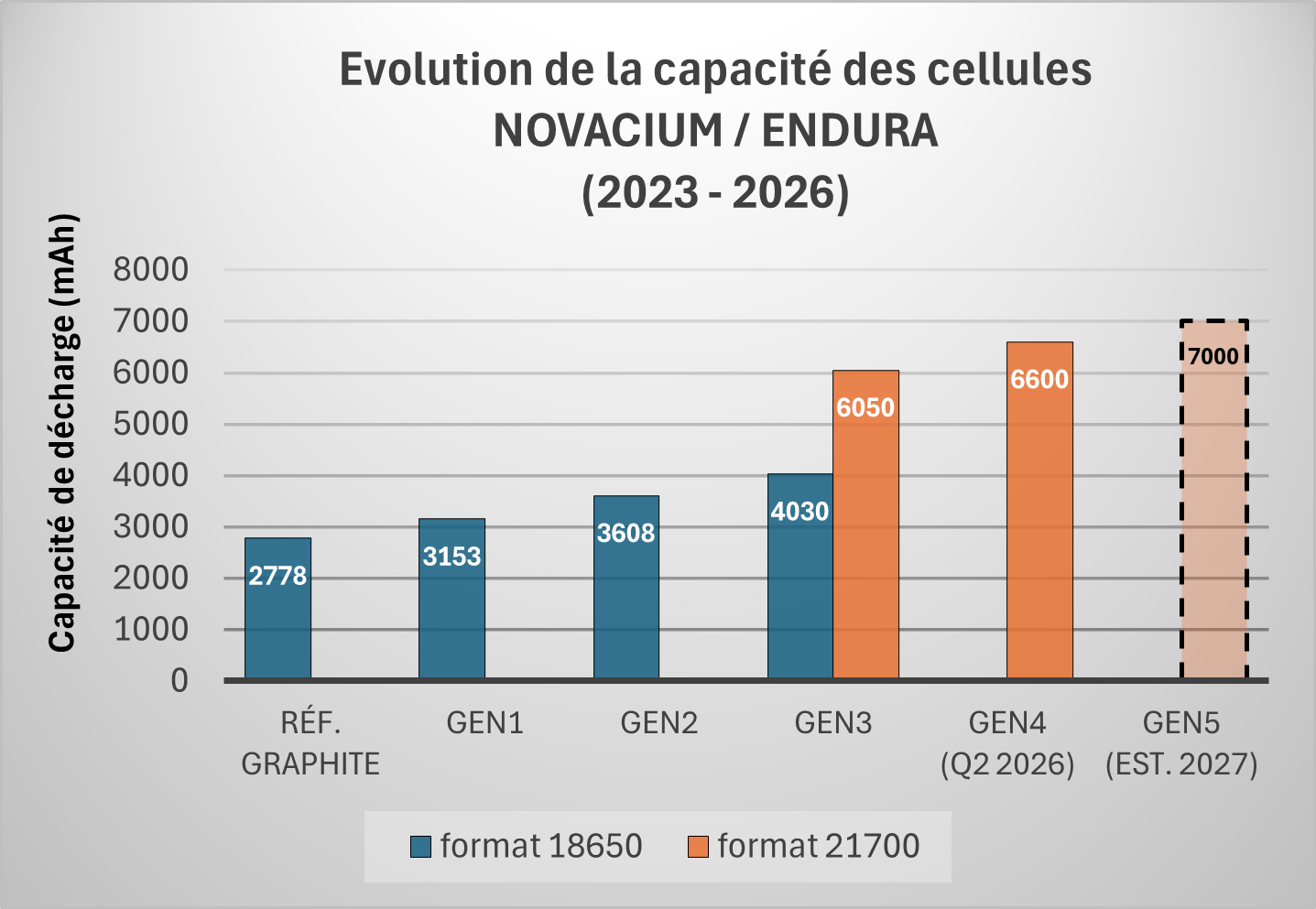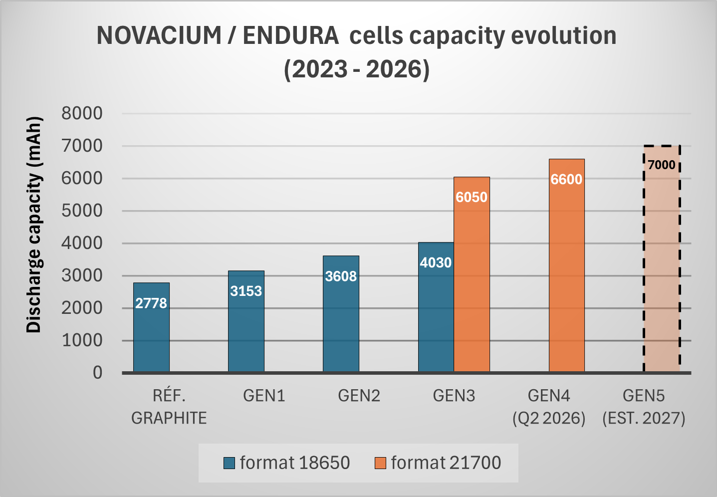 Starting from the far left, the first bar shows the capacity of the 100% graphite reference battery at approximately 2,778 mAh in 18650 formats. Successive bars then show the capacity achieved with GEN1 material (~3,153 mAh), GEN2 material (~3,808 mAh), and GEN3 material (~4,030 mAh) in 18650 formats, alongside their 21700 counterparts, which reach ~6,050 mAh for GEN3. GEN4, measured in Q2 2026, achieves 6,600 mAh in 21700 formats, with GEN5 projected at an estimated 7,000 mAh by 2027.
