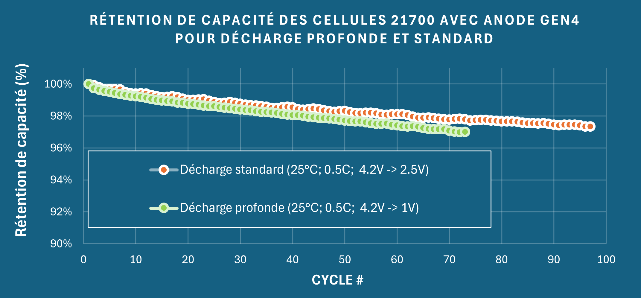 Le fait que la capacité soit restée supérieure à 96 % après 70 cycles dans des conditions de décharge profonde (4,2 V–1 V, 0,5 C) n'est donc pas simplement le résultat d'un cycle de charge-décharge, mais un indicateur de la résilience mécanique et électrochimique. Le graphique 2 illustre directement ce comportement : les courbes de décharge standard et de décharge profonde conservent toutes deux des trajectoires remarquablement stables sur 70 cycles, le protocole de décharge profonde ne présentant qu'une perte de capacité légèrement supérieure à celle du protocole standard. Cela confirme que la structure de GEN4, qui utilise une architecture graphite-silicium plutôt que du silicium pur, continue de gérer efficacement l'expansion volumétrique même lorsque la fenêtre de tension est considérablement élargie.