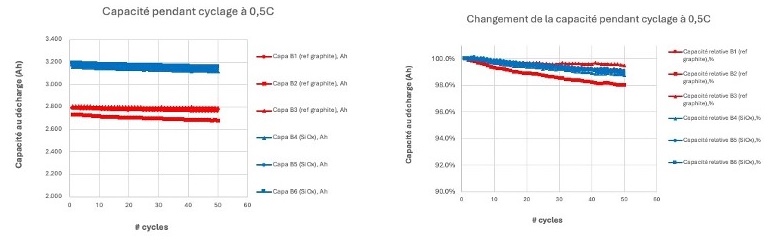 Analysis of the data in Figure 1, Left reveals that the three industrial-type batteries, which utilize Novacium’s custom-engineered silicon base material blend (blue lines), continue to demonstrate impressive performance at the 50-cycle mark. These batteries exhibit a high discharge capacity of approximately 3.18 Ampere-hours (Ah), surpassing the benchmark set by three comparison batteries (red lines) with a capacity of 2.70 Ah. These results mark another significant milestone after 50 cycles of testing. These results, confirm and extend the 14% enhancement in full-battery capacity compared to 100% graphite benchmark batteries, that was observed in the previous 5 and 25 cycles testing.