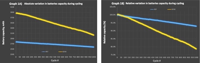 Le graphique 1A présente la variation absolue de la capacité de la batterie (en mAh) de la référence 100 % graphite (la ligne bleue) et des batteries GEN3 (la ligne jaune), sur 1 000 cycles [1]. De plus, le graphique 1B met en évidence la variation de capacité relative pour les mêmes batteries utilisées dans le graphique 1A.