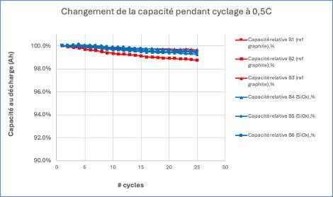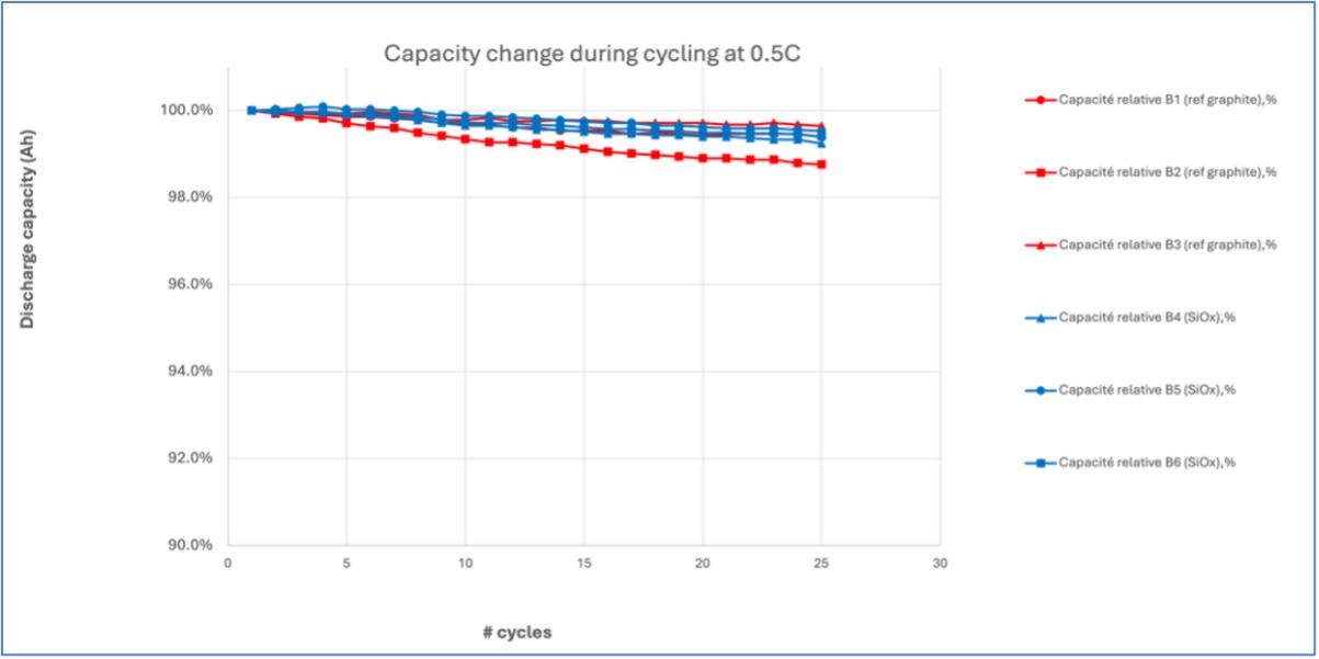 The graph displayed below (Figure 1) showcases the capacity outcomes over the initial 25 testing cycles. The three blue lines depict the cycle performance of 18650 batteries comprised of 90% wt graphite and 10% wt Novacium’s custom-engineered SiOx blend. Conversely, the three red lines illustrate the cycle performance of 18650 batteries utilizing a composition of 100% graphite.