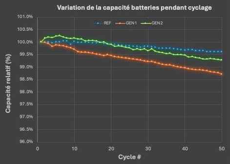 - Testing results at 50 cycles of GEN2 material show an overall capacity improvement of approximately 30% compared to the graphite benchmark and 14% better compared to Gen 1 material, without any noticeable cycle degradation [1].