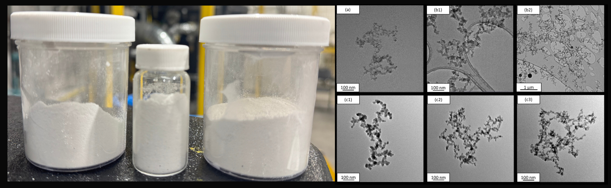 [3] TEM images of Evonik’s commercial fumed silica material were obtained from the article: “Quantification of branching in fumed silica” by Andrew Mulderig, Gregory Beaucage⁎, Karsten Vogt, Hanqiu Jiang, and Vikram Kuppa, published in the Journal of Aerosol Science. These reference images were used for comparative analysis alongside lab- and pilot-scale samples produced by HSPI.