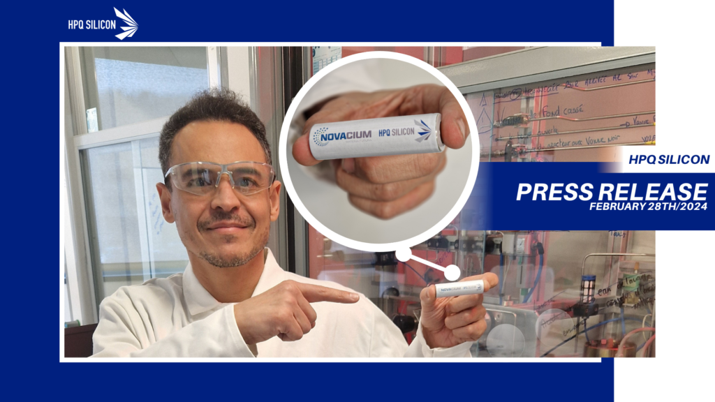 February 15, 2024by Team HPQ HPQ announces that Commercial Li-ion Batteries have been made with Novacium’s First Gen Engineered SiOx Material
